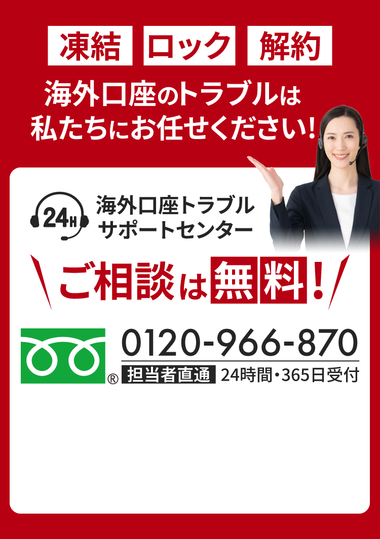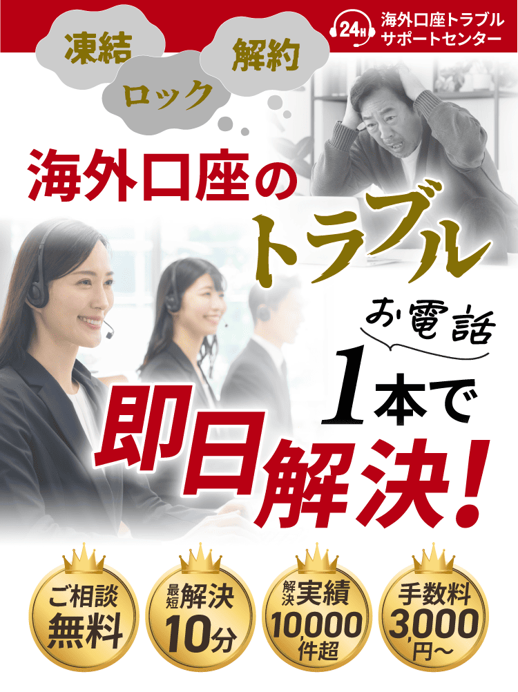 海外口座トラブルサポートセンター。凍結・ロック・解約、海外口座のトラブルをお電話1本で即日解決します。