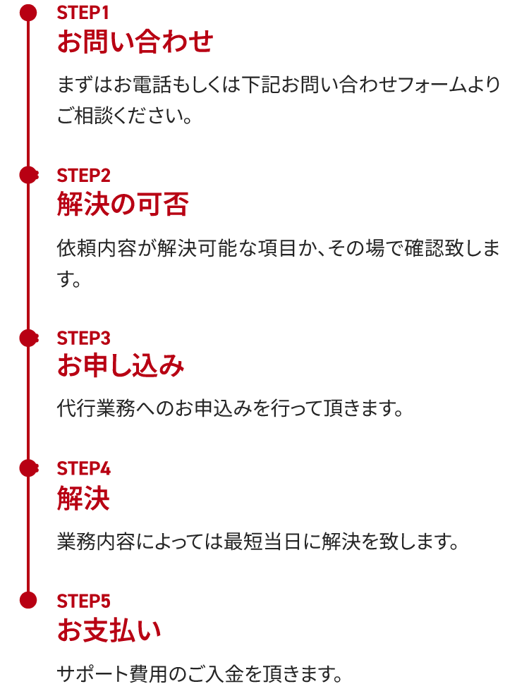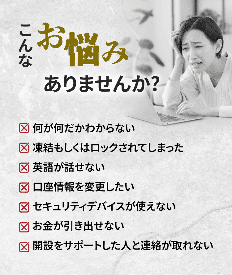 弊社ではこのような海外口座トラブルを抱えた方に専門的なノウハウを使って、安全にそして日本にいながら口座運用が再開できるよう丁寧迅速なサポートを提供します。
